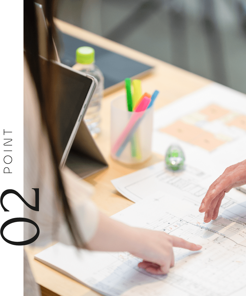 私たちには、長年水関係の大規模修繕を行ってきた親会社のノウハウがあります。お客様の要望にはとことんお付き合いしつつも、プロとして無理な設計や排水工事は行いません。また耐震診断士、アスベスト調査士などの資格を持った経験豊富なプランナーが在籍しており、長く安心して住んでいただけるリノベーションをご提案しています。